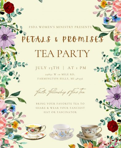 Join us for a delightful time of fellowship, inspiration, and elegance at our upcoming Women’s Ministry Tea Party! Come dressed in your tea-time best and bring a friend or two. We can’t wait to share this special moment with you!